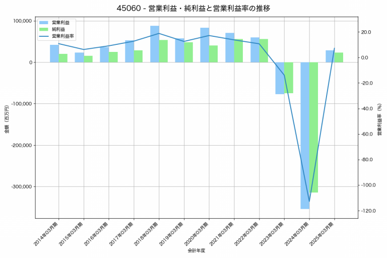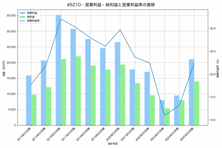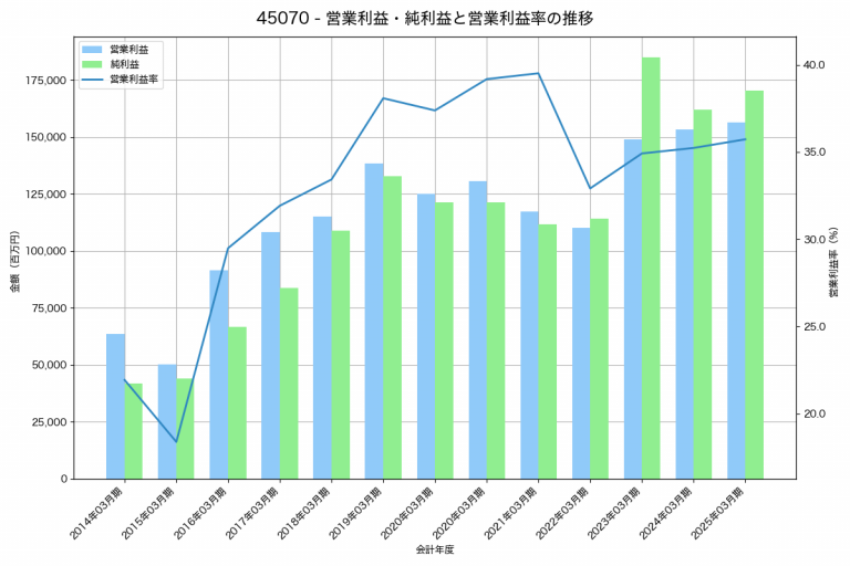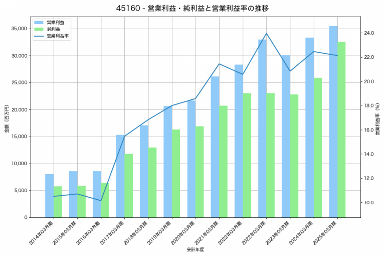 科研製薬の2025年03月期の営業利益は21,034百万円、営業利益率は22.4%と前年比11,521百万円増、営業利益率は9.2%pt増です。