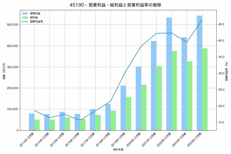 中外製薬の2024年12月期の営業利益は542,002百万円、営業利益率は46.3%と前年比102,828百万円増、営業利益率は6.8%pt増です。
