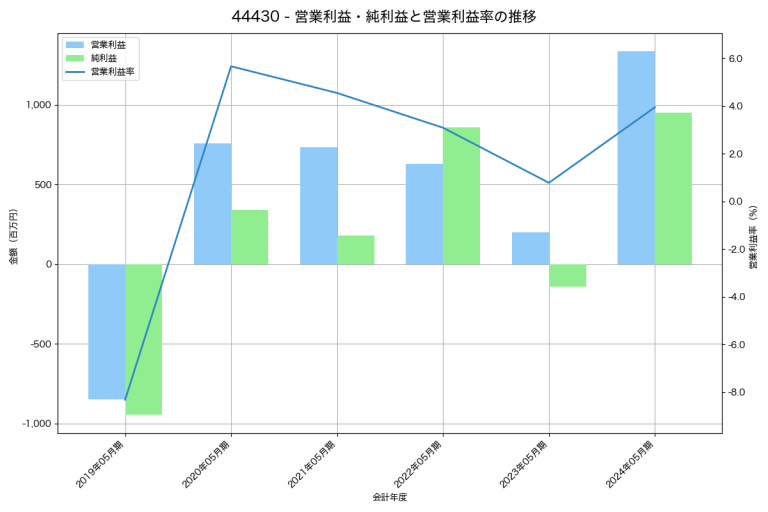 Sansanの2024年05月期の営業利益は1,337百万円、営業利益率は3.9%と前年比1,138百万円増、営業利益率は3.2%pt増です。