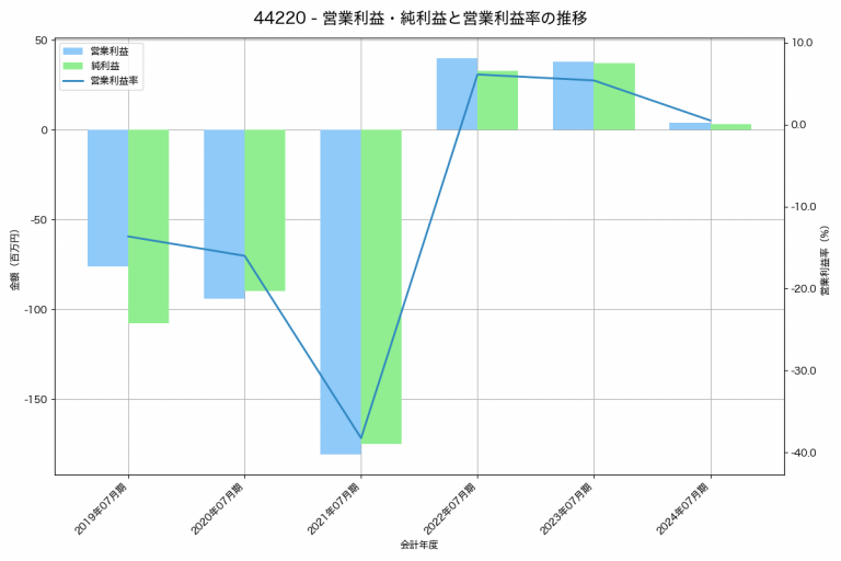 VALUENEXの2024年07月期の営業利益は4百万円、営業利益率は0.5%と前年比34百万円減、営業利益率は4.9%pt減です。