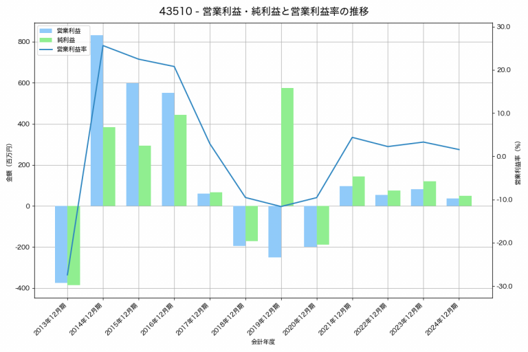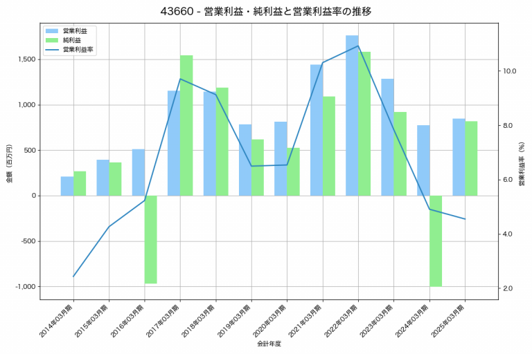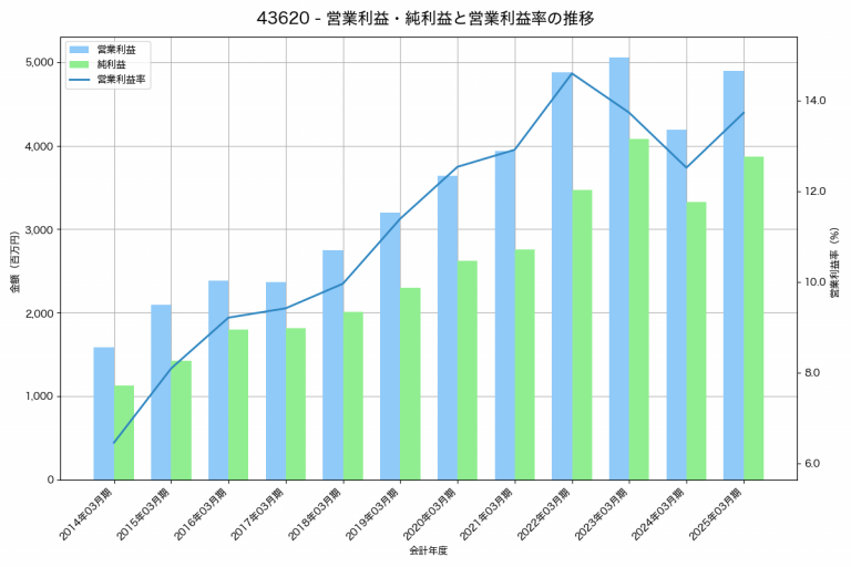 日本精化の2025年03月期の営業利益は4,895百万円、営業利益率は13.7%と前年比698百万円増、営業利益率は1.2%pt増です。