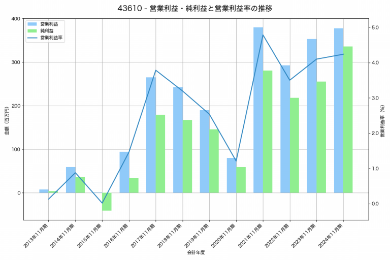 川口化学工業の2024年11月期の営業利益は378百万円、営業利益率は4.2%と前年比25百万円増、営業利益率は0.1%pt増です。
