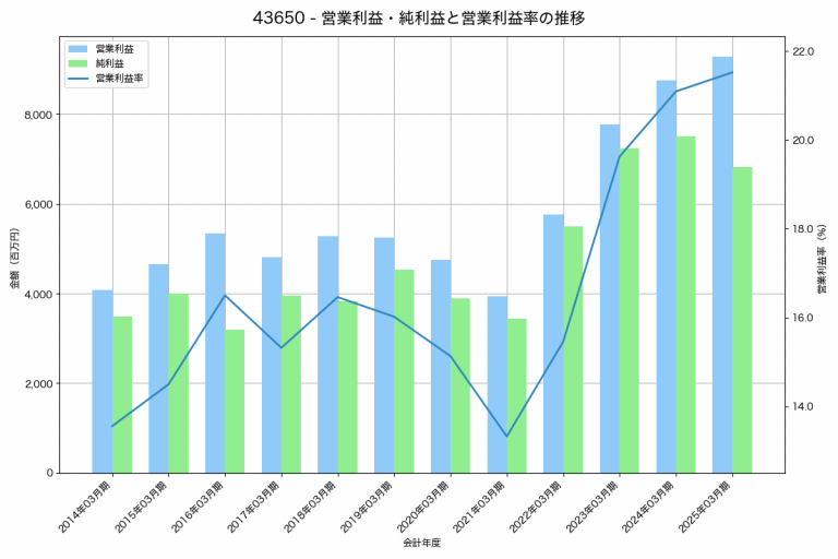 松本油脂製薬の2025年03月期の営業利益は9,281百万円、営業利益率は21.5%と前年比523百万円増、営業利益率は0.4%pt増です。