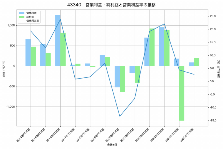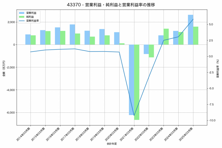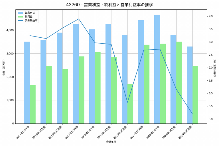 ぴあの2025年03月期の営業利益は2,636百万円、営業利益率は5.8%と前年比1,427百万円増、営業利益率は2.8%pt増です。