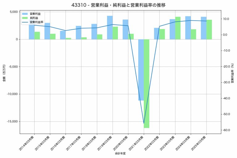 テイクアンドギヴ・ニーズの2025年03月期の営業利益は4,104百万円、営業利益率は8.6%と前年比104百万円減、営業利益率は0.3%pt減です。