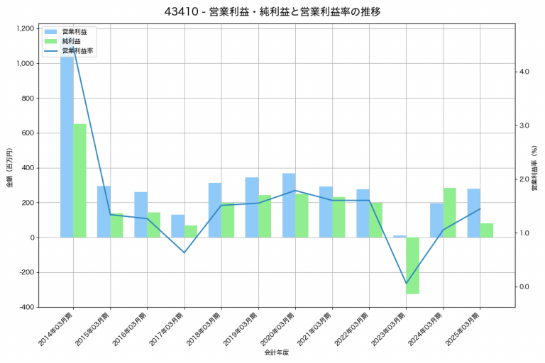 西菱電機の2025年03月期の営業利益は279百万円、営業利益率は1.4%と前年比84百万円増、営業利益率は0.4%pt増です。