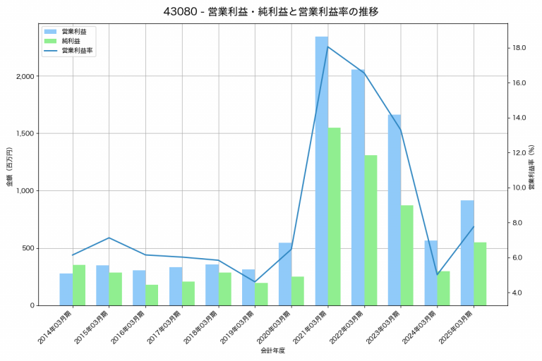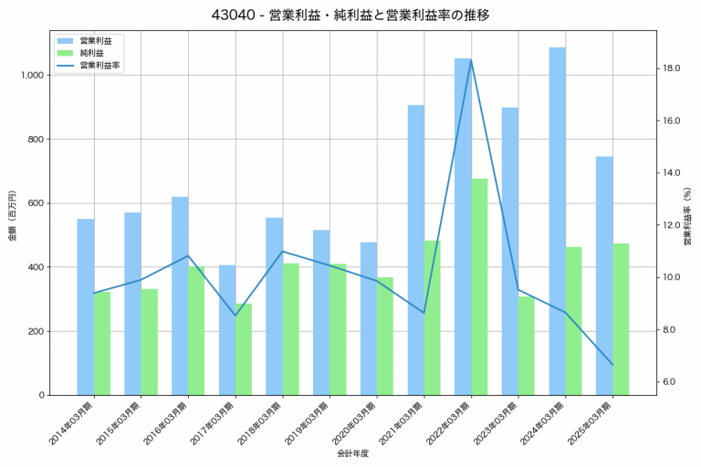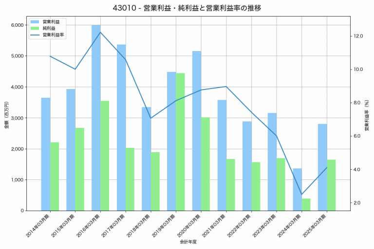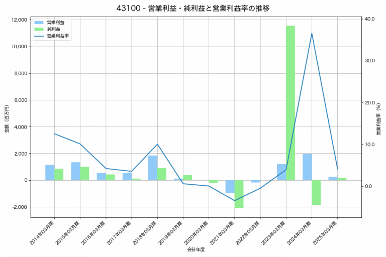 アミューズの2025年03月期の営業利益は2,798百万円、営業利益率は4.1%と前年比1,431百万円増、営業利益率は1.6%pt増です。