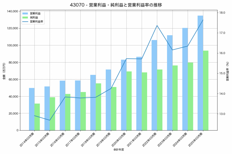 野村総合研究所の2025年03月期の営業利益は134,907百万円、営業利益率は17.6%と前年比14,496百万円増、営業利益率は1.3%pt増です。