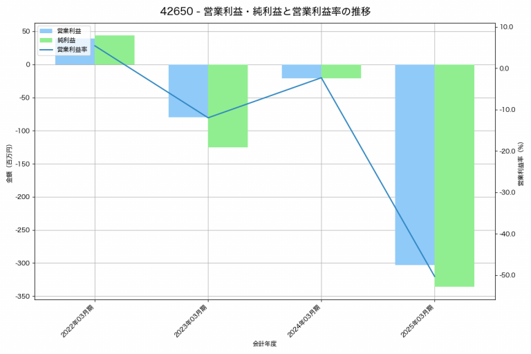 Institution for a Global Societyの2025年03月期の営業利益は-303百万円、営業利益率は-50.3%と前年比282百万円減、営業利益率は48.0%pt減です。