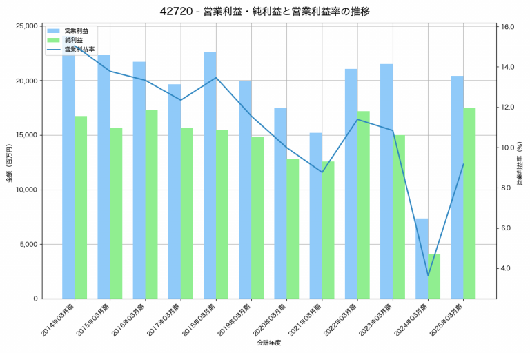 日本化薬の2025年03月期の営業利益は20,401百万円、営業利益率は9.2%と前年比13,064百万円増、営業利益率は5.5%pt増です。