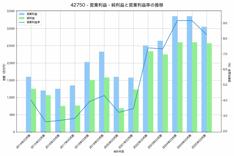 カーリットの2025年03月期の営業利益は3,046百万円、営業利益率は8.3%と前年比306百万円減、営業利益率は0.9%pt減です。