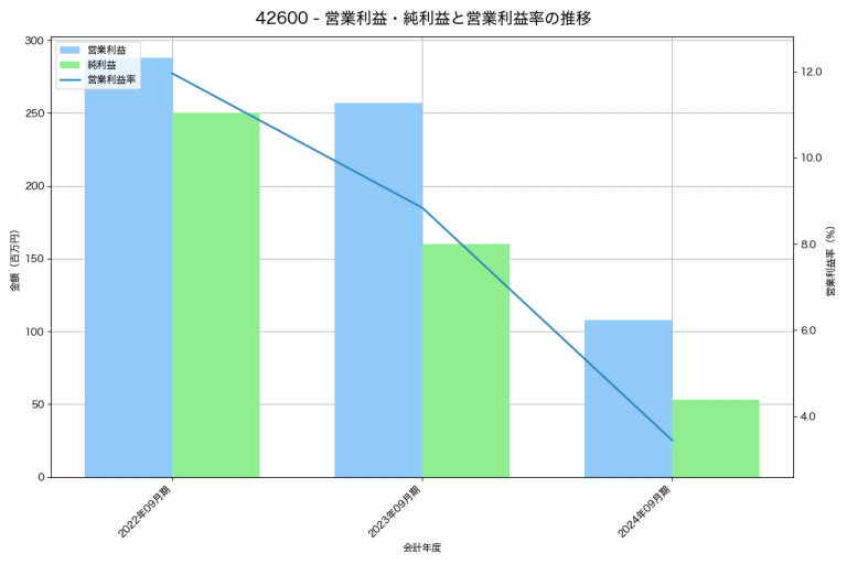 ハイブリッドテクノロジーズの2024年09月期の営業利益は108百万円、営業利益率は3.4%と前年比149百万円減、営業利益率は5.4%pt減です。