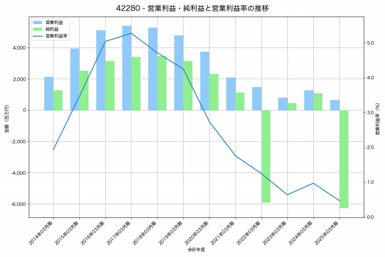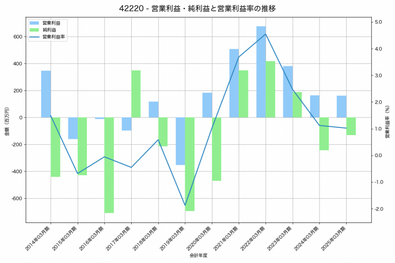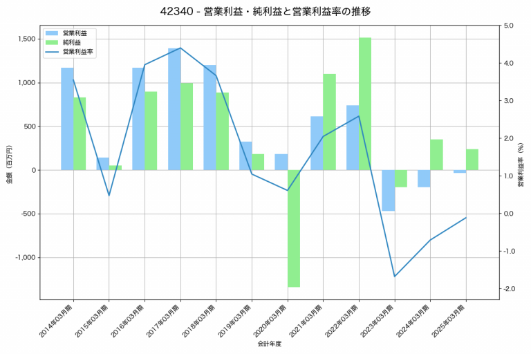 サンエー化研の2025年03月期の営業利益は-34百万円、営業利益率は-0.1%と前年比161百万円増、営業利益率は0.6%pt増です。