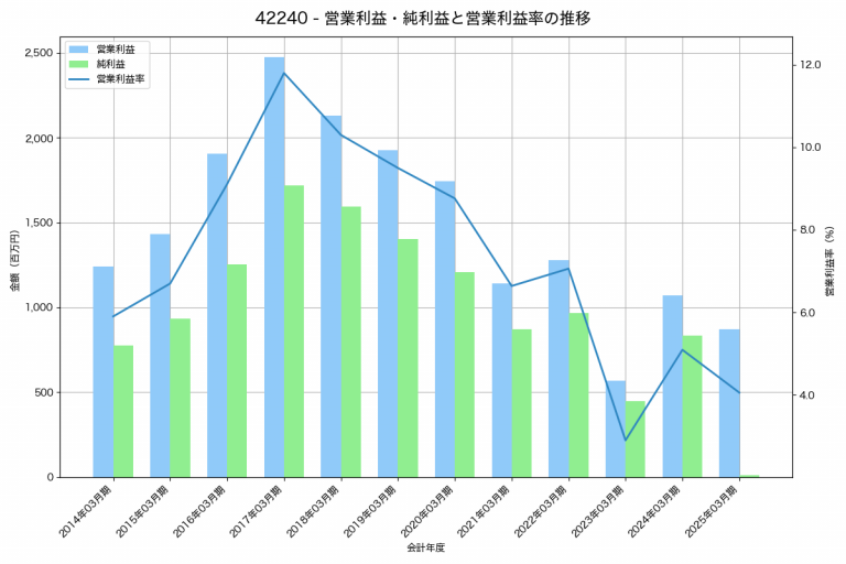 ロンシール工業の2025年03月期の営業利益は870百万円、営業利益率は4.1%と前年比201百万円減、営業利益率は1.0%pt減です。
