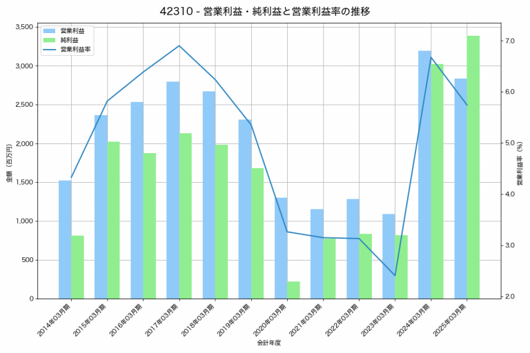 群栄化学工業の2025年03月期の営業利益は2,293百万円、営業利益率は7.5%と前年比436百万円減、営業利益率は1.5%pt減です。