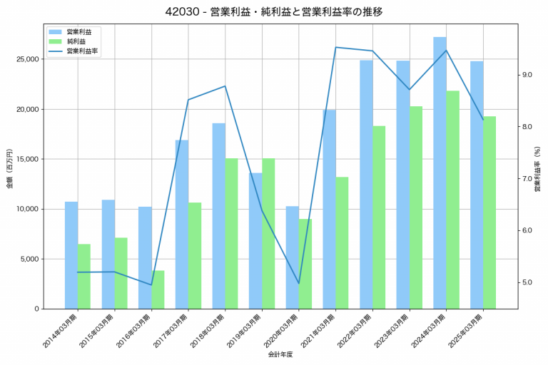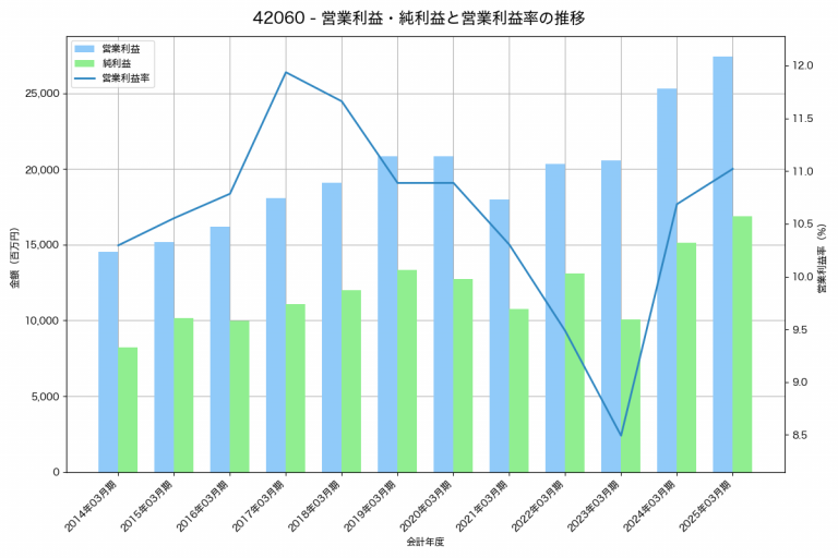 アイカ工業の2025年03月期の営業利益は27,408百万円、営業利益率は11.0%と前年比2,122百万円増、営業利益率は0.3%pt増です。