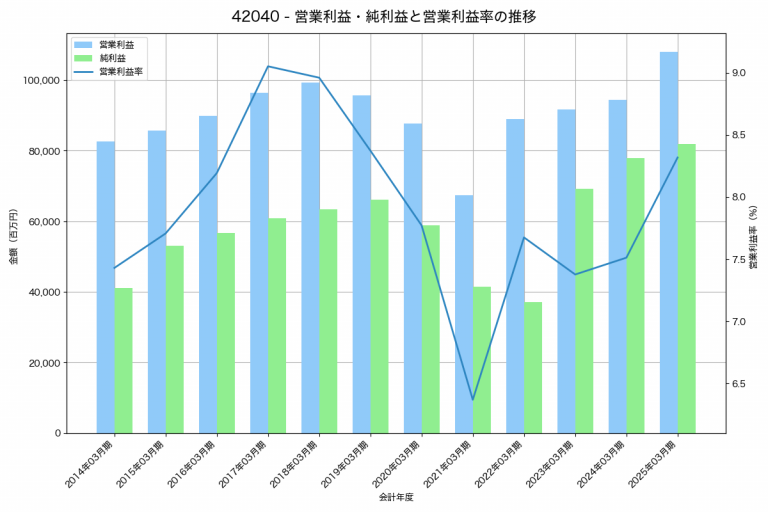 積水化学工業の2025年03月期の営業利益は107,951百万円、営業利益率は8.3%と前年比13,552百万円増、営業利益率は0.8%pt増です。