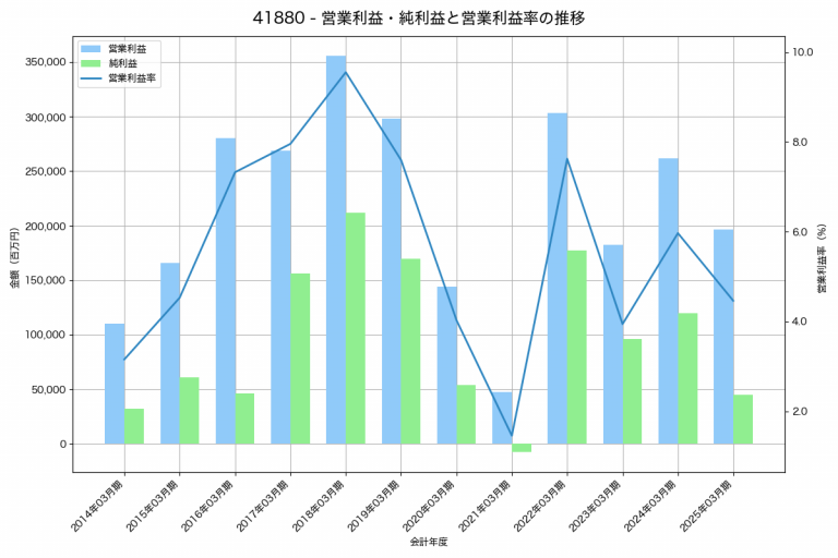 三菱ケミカルグループの2025年03月期の営業利益は196,694百万円、営業利益率は4.5%と前年比65,137百万円減、営業利益率は1.5%pt減です。