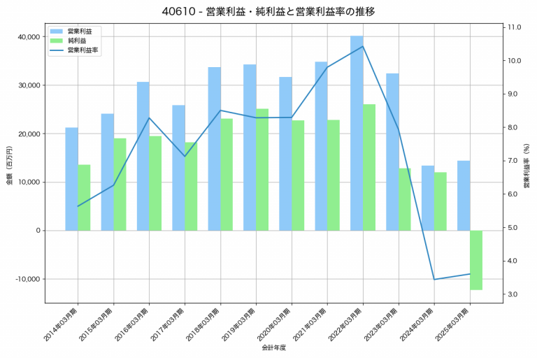 デンカの2025年03月期の営業利益は14,413百万円、営業利益率は3.6%と前年比1,037百万円増、営業利益率は0.2%pt増です。