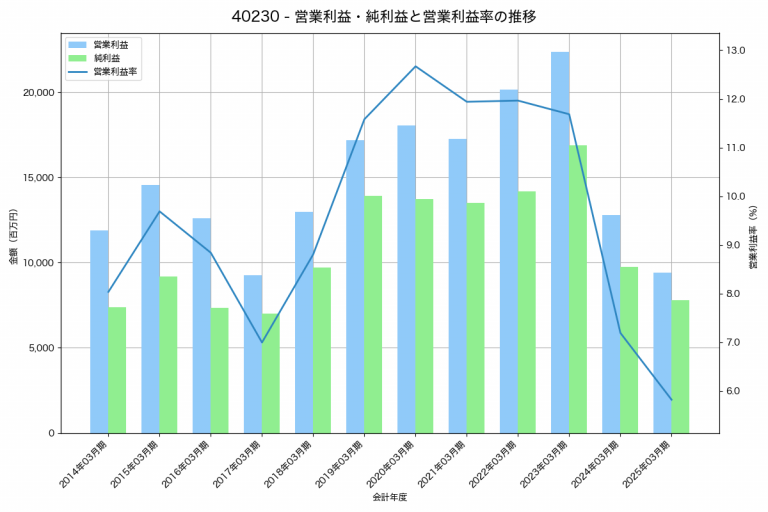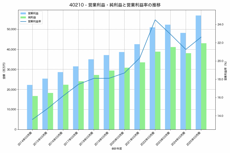 日産化学の2025年03月期の営業利益は56,833百万円、営業利益率は22.6%と前年比8,632百万円増、営業利益率は1.3%pt増です。