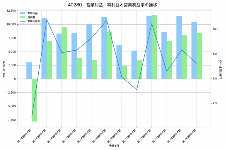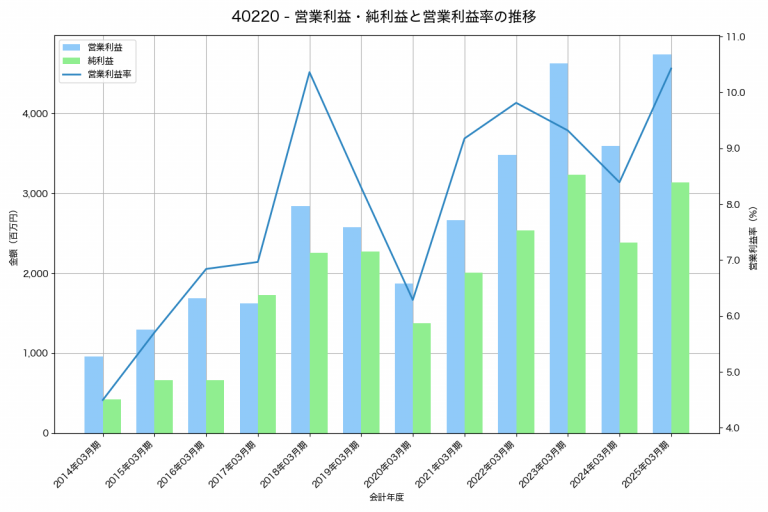 ラサ工業の2025年03月期の営業利益は4,736百万円、営業利益率は10.4%と前年比1,145百万円増、営業利益率は2.0%pt増です。