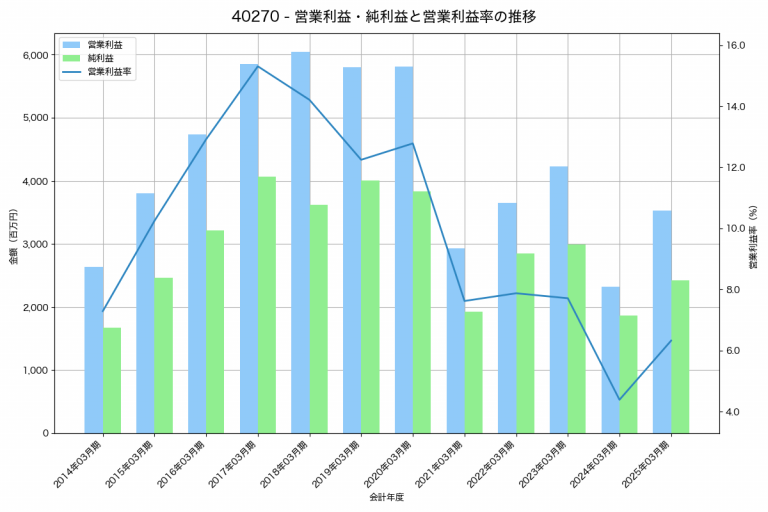 テイカの2025年03月期の営業利益は3,525百万円、営業利益率は6.3%と前年比1,200百万円増、営業利益率は1.9%pt増です。