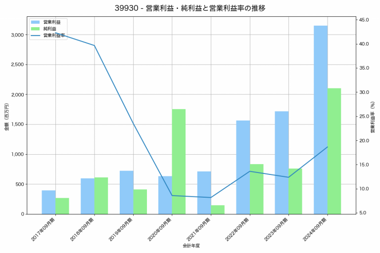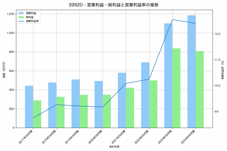 PKSHA Technologyの2024年09月期の営業利益は3,148百万円、営業利益率は18.6%と前年比1,429百万円増、営業利益率は6.3%pt増です。