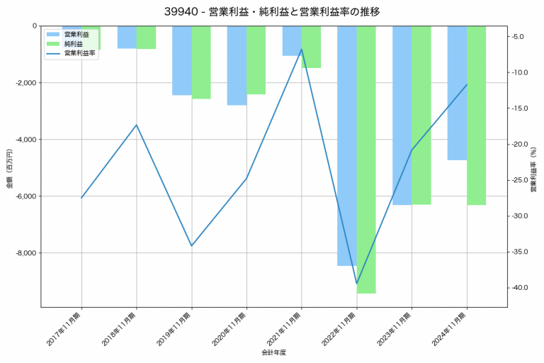 マネーフォワードの2024年11月期の営業利益は-4,735百万円、営業利益率は-11.7%と前年比1,594百万円増、営業利益率は9.1%pt増です。
