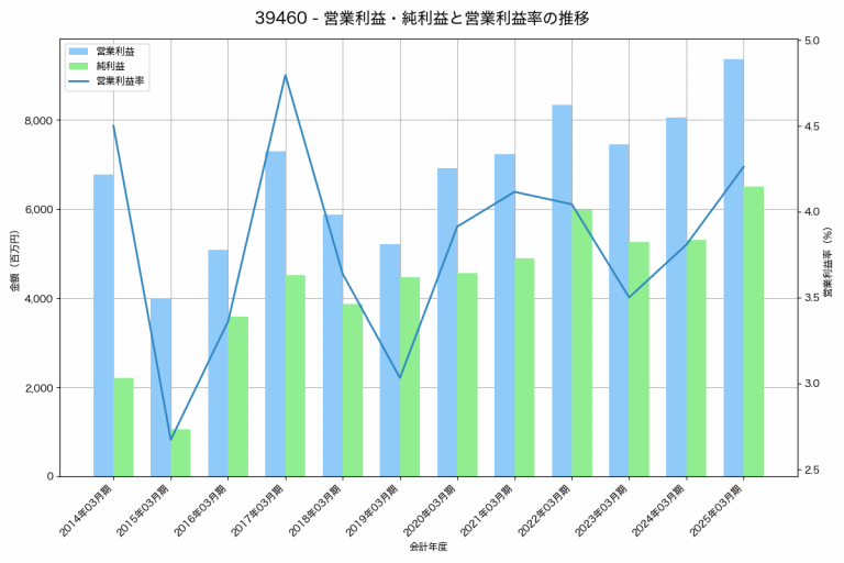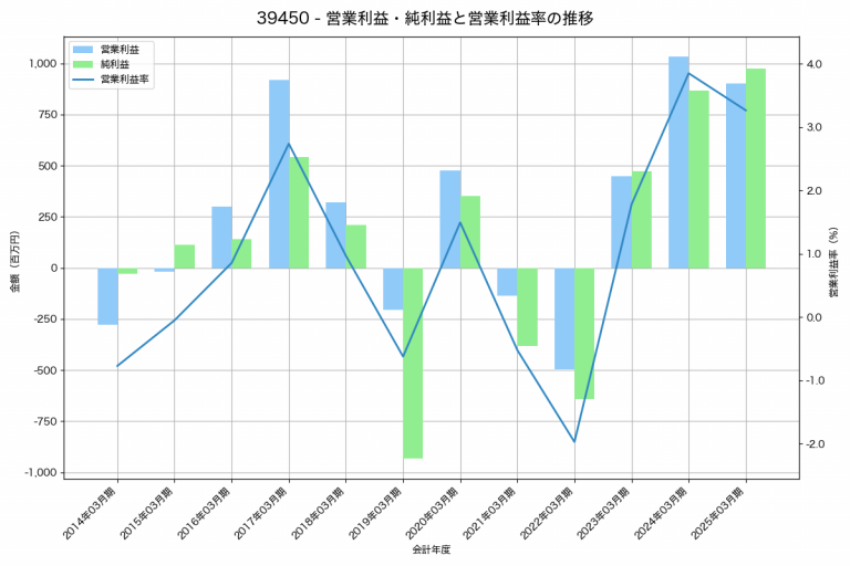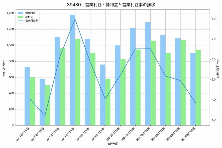 大石産業の2025年03月期の営業利益は904百万円、営業利益率は3.8%と前年比182百万円減、営業利益率は1.1%pt減です。