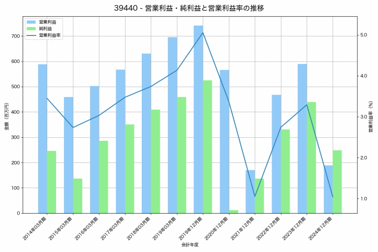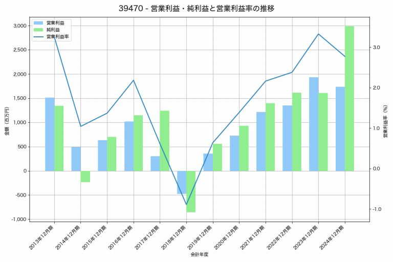 古林紙工の2024年12月期の営業利益は189百万円、営業利益率は1.0%と前年比401百万円減、営業利益率は2.2%pt減です。