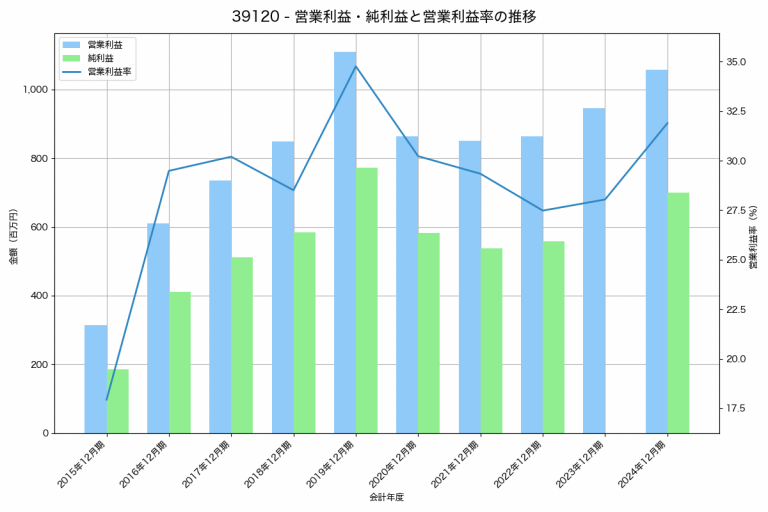 モバイルファクトリーの2024年12月期の営業利益は1,058百万円、営業利益率は31.9%と前年比113百万円増、営業利益率は3.9%pt増です。