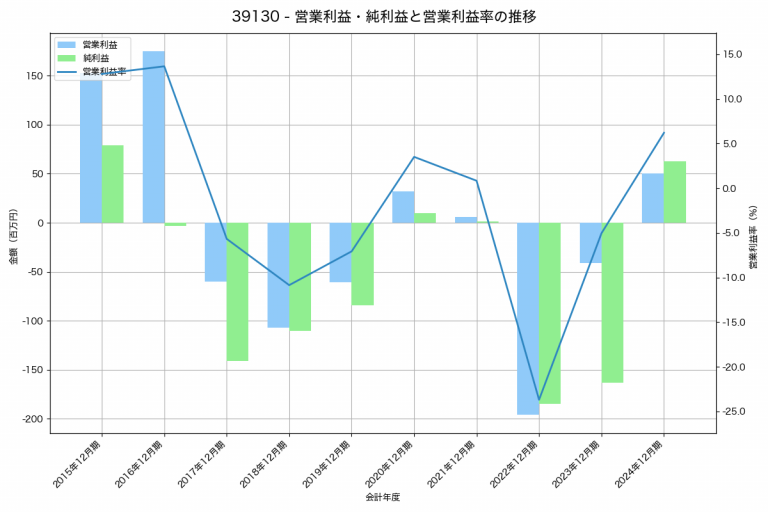 GreenBeeの2024年12月期の営業利益は50百万円、営業利益率は6.2%と前年比91百万円増、営業利益率は11.2%pt増です。