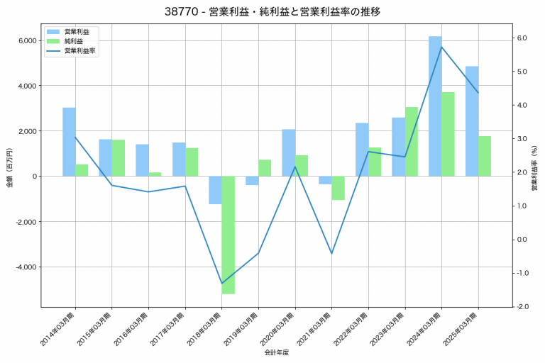 ハビックスの2025年03月期の営業利益は695百万円、営業利益率は5.2%と前年比60百万円減、営業利益率は0.5%pt減です。