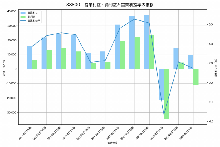 大王製紙の2025年03月期の営業利益は9,807百万円、営業利益率は1.5%と前年比4,560百万円減、営業利益率は0.7%pt減です。