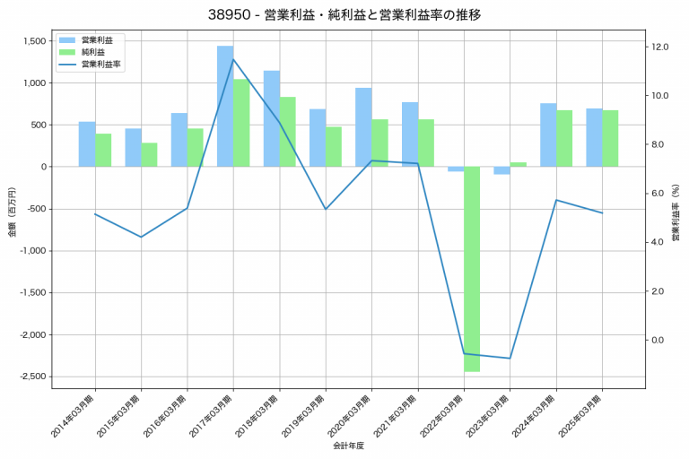 阿波製紙の2025年03月期の営業利益は432百万円、営業利益率は2.5%と前年比78百万円増、営業利益率は0.3%pt増です。