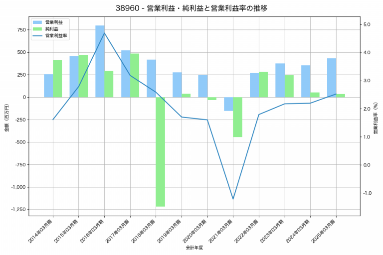 巴川コーポレーションの2025年03月期の営業利益は1,282百万円、営業利益率は3.7%と前年比49百万円減、営業利益率は0.2%pt減です。