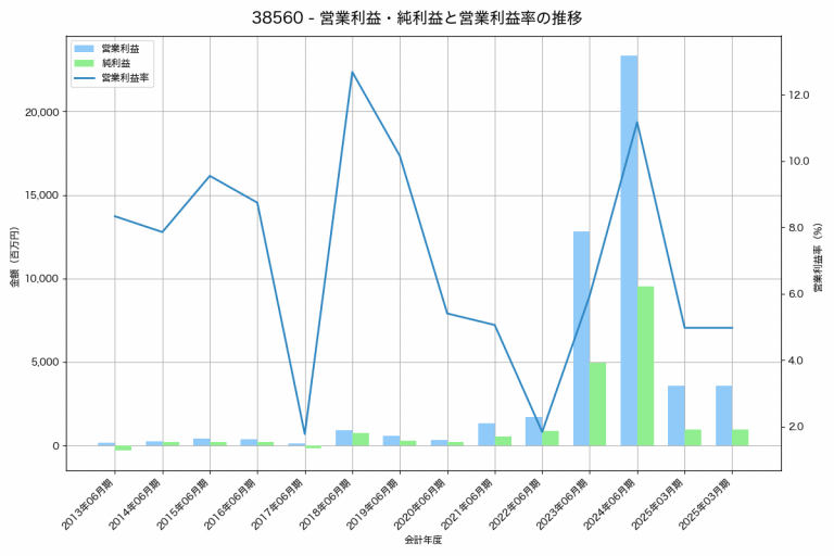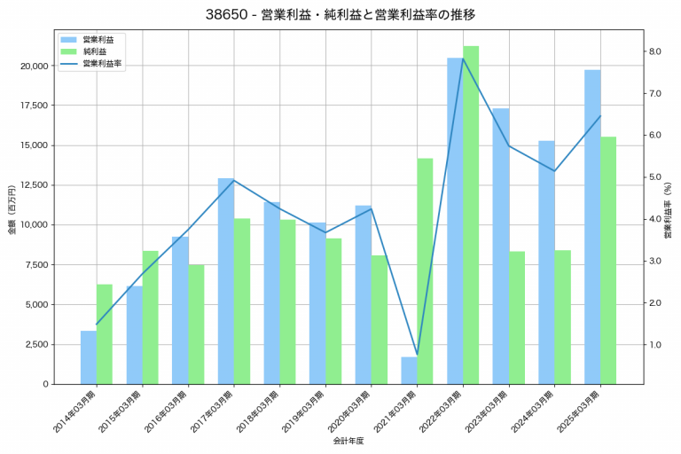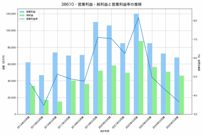 北越コーポレーションの2025年03月期の営業利益は19,727百万円、営業利益率は6.5%と前年比4,460百万円増、営業利益率は1.3%pt増です。