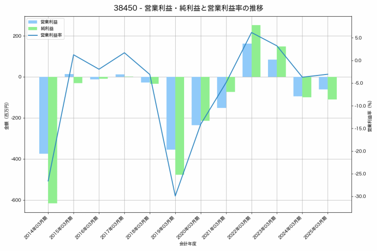 パスの2025年03月期の営業利益は-208百万円、営業利益率は-9.2%と前年比36百万円減、営業利益率は1.8%pt減です。