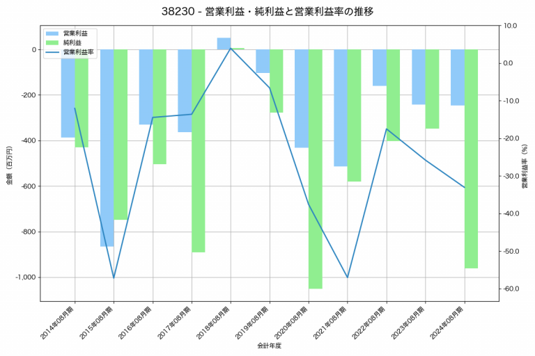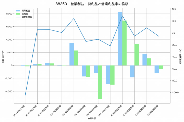 リミックスポイントの2025年03月期の営業利益は-1,211百万円、営業利益率は-5.7%と前年比2,954百万円減、営業利益率は14.2%pt減です。