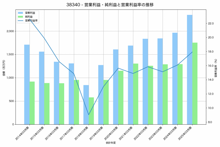 朝日ネットの2025年03月期の営業利益は2,345百万円、営業利益率は17.9%と前年比380百万円増、営業利益率は1.8%pt増です。
