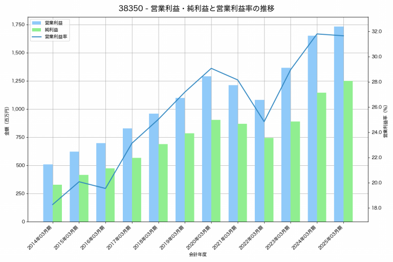 eBASEの2025年03月期の営業利益は1,731百万円、営業利益率は31.7%と前年比80百万円増、営業利益率は0.1%pt減です。