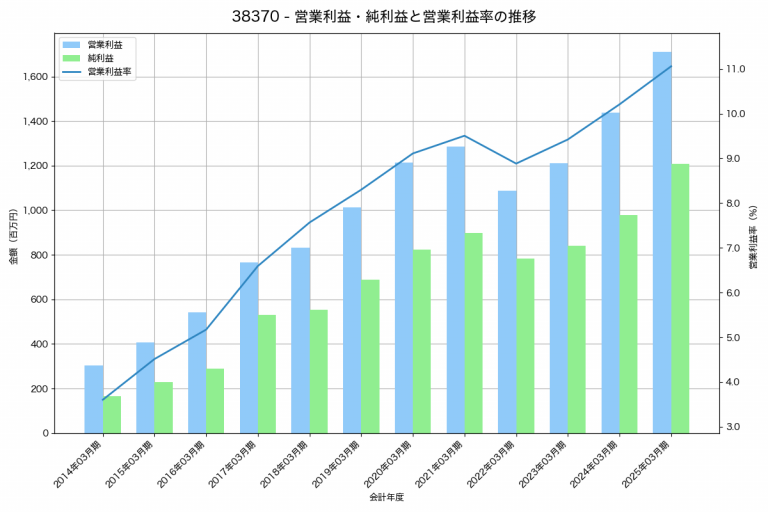 アドソル日進の2025年03月期の営業利益は1,710百万円、営業利益率は11.1%と前年比273百万円増、営業利益率は0.9%pt増です。