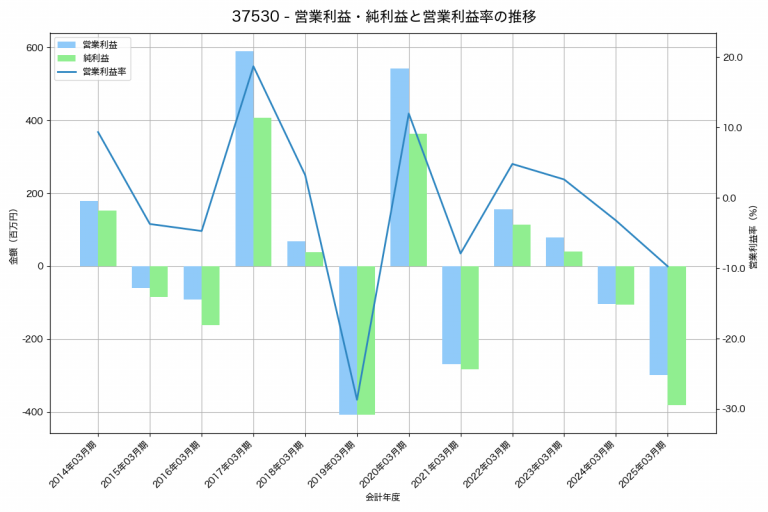 フライトソリューションズの2025年03月期の営業利益は-298百万円、営業利益率は-9.7%と前年比195百万円減、営業利益率は6.5%pt減です。
