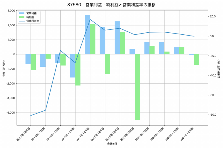 アエリアの2024年12月期の営業利益は-42百万円、営業利益率は-0.2%と前年比518百万円減、営業利益率は2.3%pt減です。