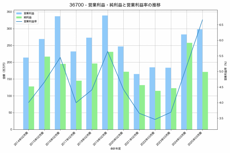 協立情報通信の2025年03月期の営業利益は298百万円、営業利益率は6.7%と前年比15百万円増、営業利益率は1.5%pt増です。