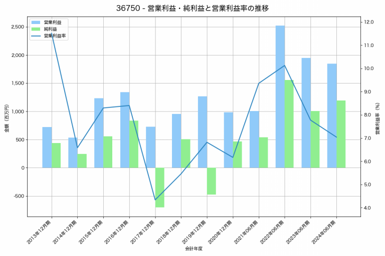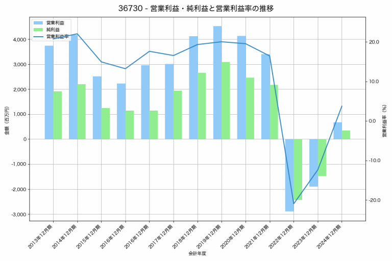 ブロードリーフの2024年12月期の営業利益は674百万円、営業利益率は3.7%と前年比2,576百万円増、営業利益率は16.1%pt増です。