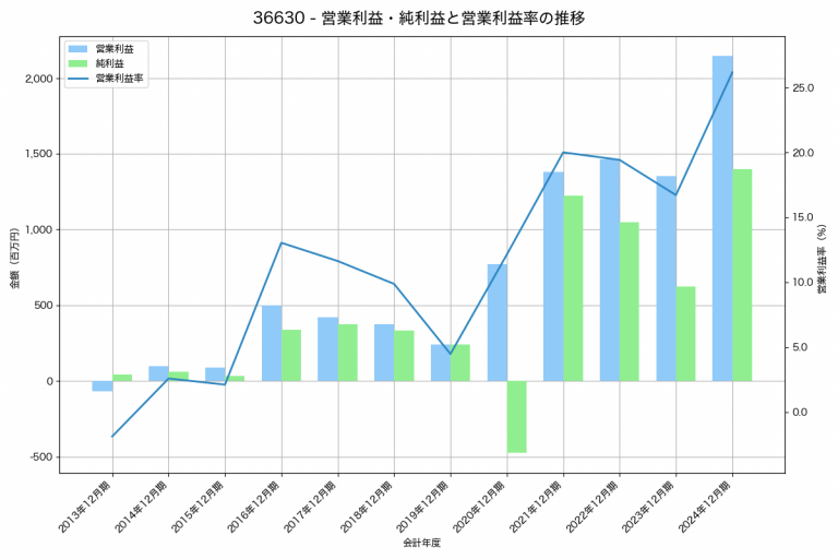 セルシスの2024年12月期の営業利益は2,146百万円、営業利益率は26.2%と前年比794百万円増、営業利益率は9.4%pt増です。