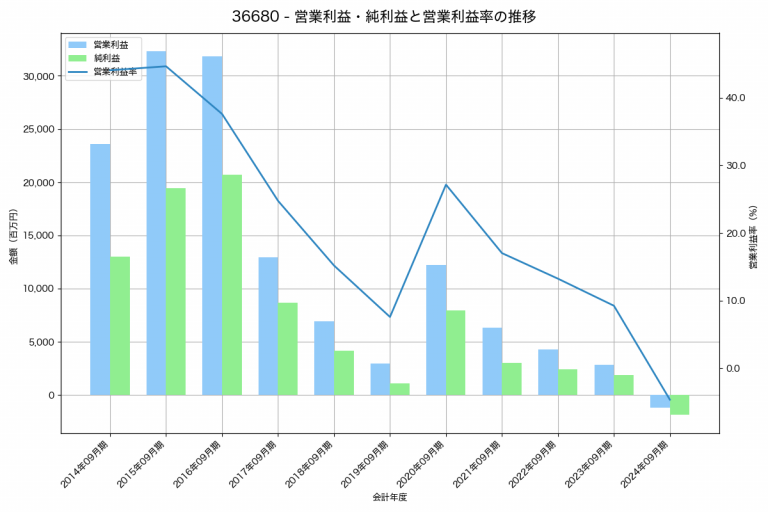 コロプラの2024年09月期の営業利益は-1,208百万円、営業利益率は-4.7%と前年比4,066百万円減、営業利益率は13.9%pt減です。