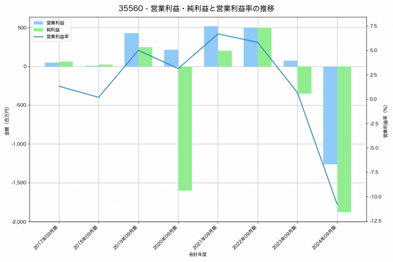 リネットジャパングループの2024年09月期の営業利益は-1,263百万円、営業利益率は-10.8%と前年比1,336百万円減、営業利益率は11.5%pt減です。