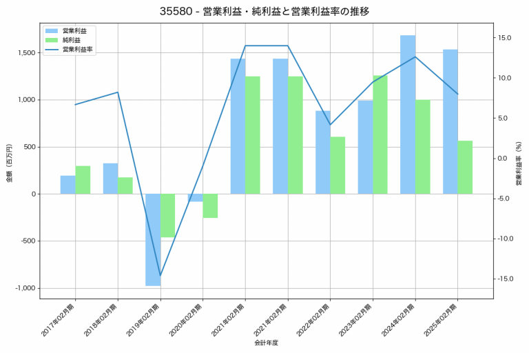 ジェイドグループの2025年02月期の営業利益は1,535百万円、営業利益率は8.0%と前年比150百万円減、営業利益率は4.6%pt減です。